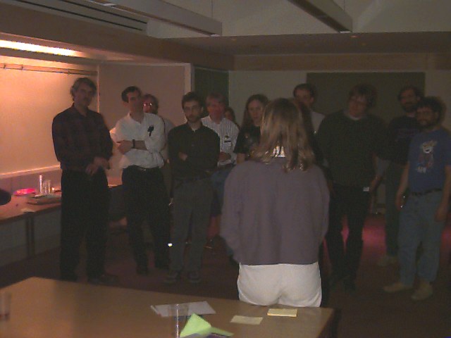 Susan Coombs discusses Larry's Lisp programming style to the group.